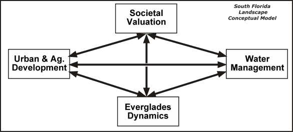 Water managers in south Florida are responsible for balancing the various demands placed on our public water resources in order to achieve a sustainable and productive environment for humans and the natural system on which we all depend. Field/lab research and modeling can aid in understanding the dynamics of the Everglades system in response to current and future water management practices. The interactions among the four Conceptual Model components shown here drives the ecological and economic system of south Florida. Water management attempts to integrate our societal values with the resource demands of urban, agricultural, and natural components of the regional landscape.