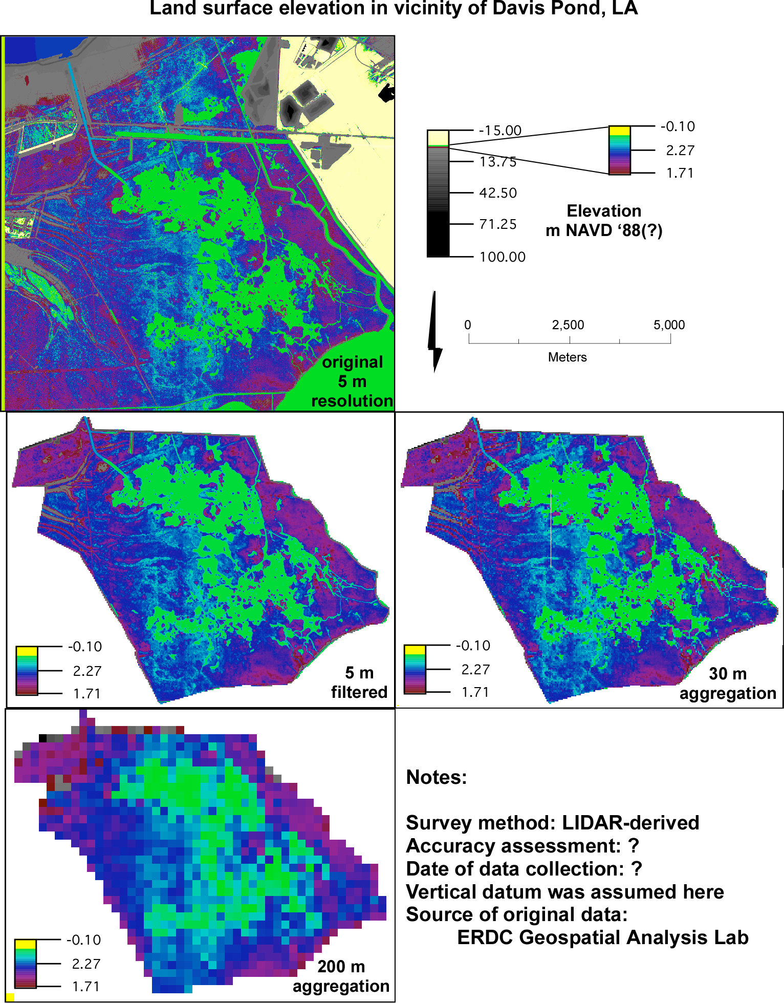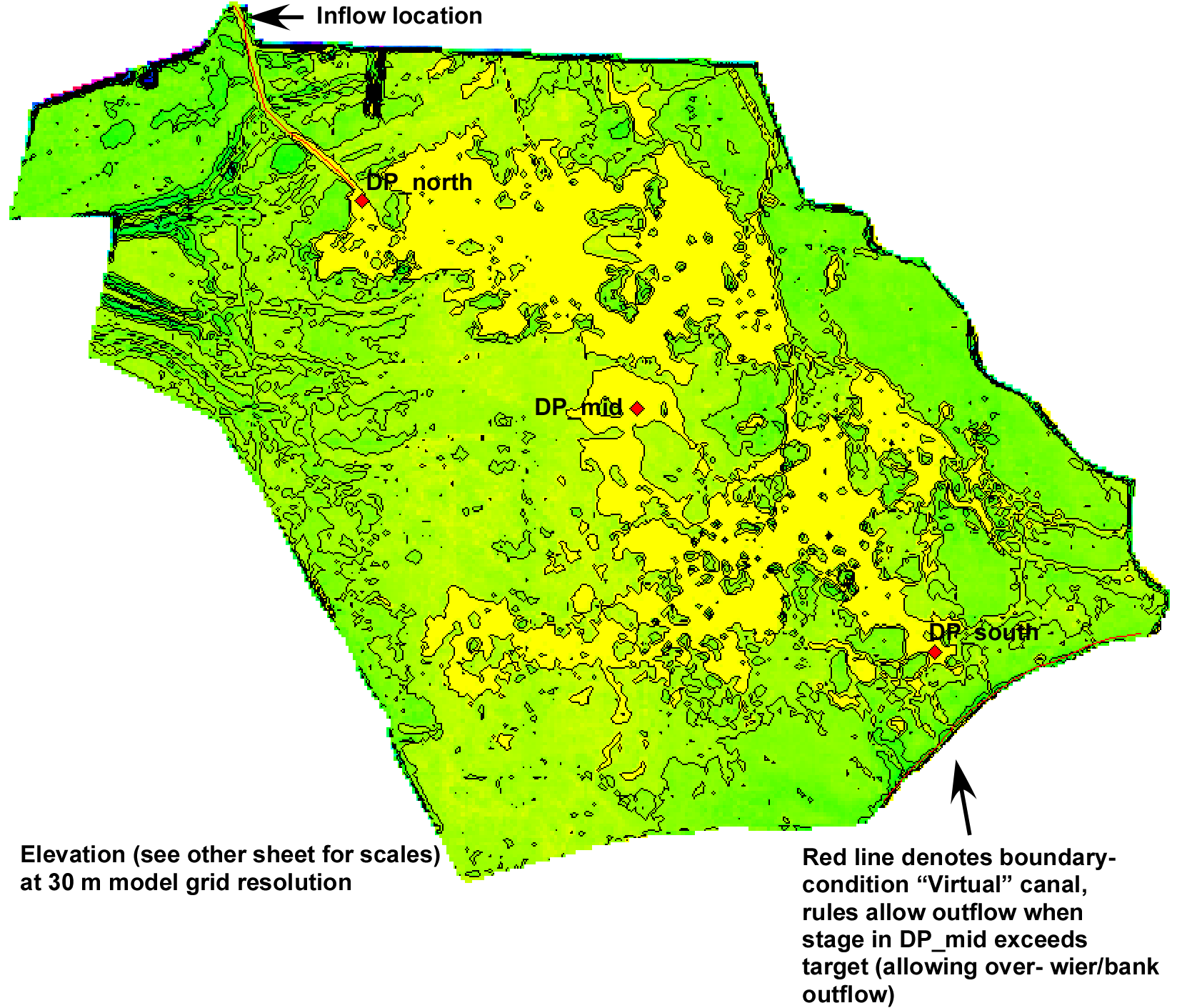Collaborating with Dr. Carl Cerco of the Engineer Research and Development Center (ERDC), US Army Corps of Engineers, we developed an initial model application (v2.8.1 of EcoLandMod framework, 30 m grid resolution) for a freshwater marsh impoundment in southern Louisiana. The white paper produced at ERDC summarizes that initial development for the region which is depicted in the below figures.